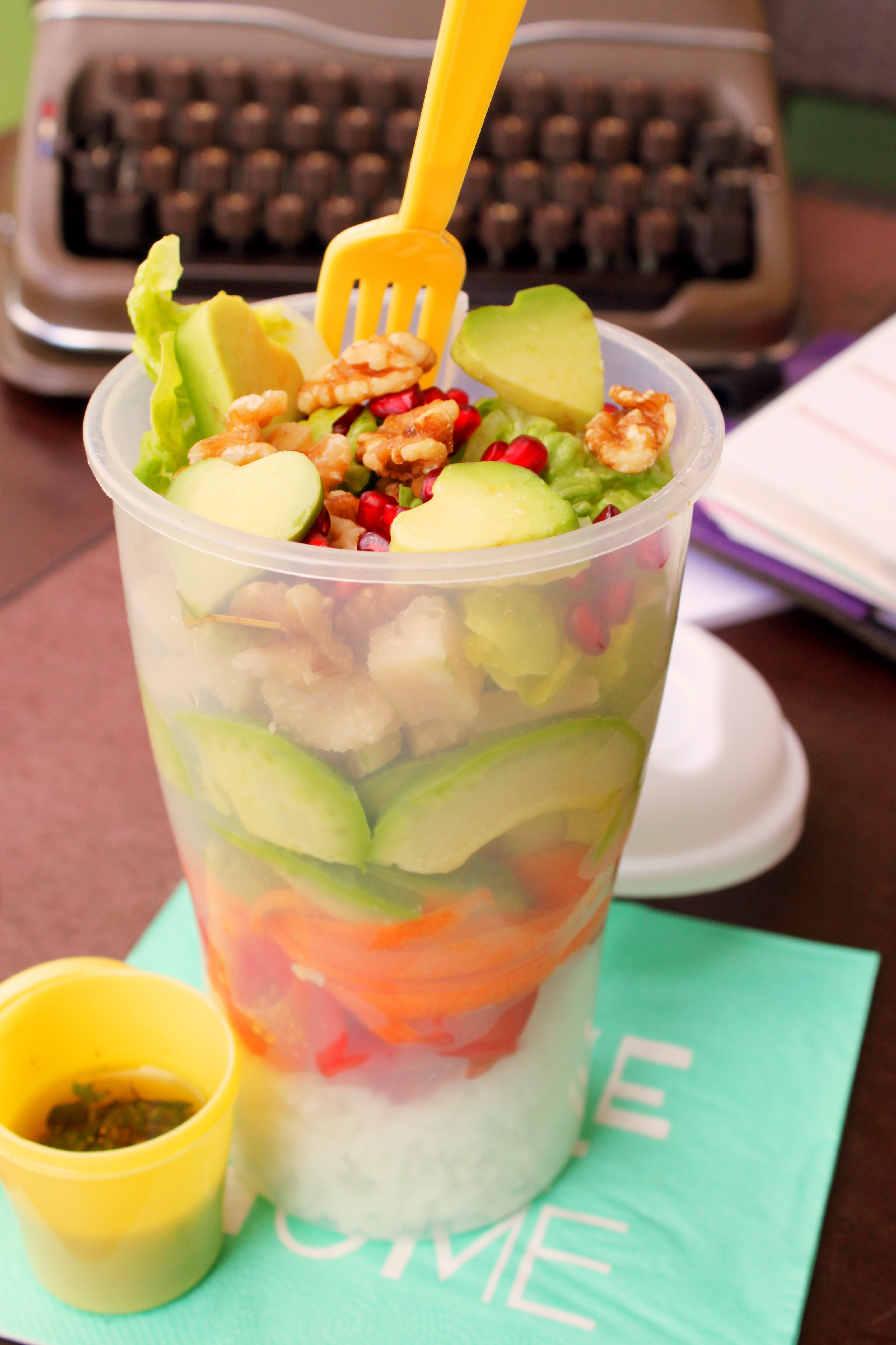 Ich nehme meinen Salat am liebsten in einer Box mit extra Dressing-Behälter und einklemmbarer Gabel mit.