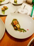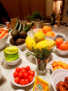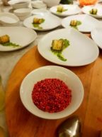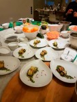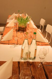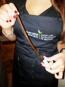 Aufgeteilt in Gruppen bereiten wir mit unseren Partnern und mit Hilfe von Frauke und ihren Rezepten die leckeren Speisen zu. Zwischendrin erklärt sie uns immer wieder etwas zu den Zutaten und gibt Tipps beim verarbeiten. Wusstet ihr z.B. dass ihr Ingwer gar nicht schälen müsst, sondern ganz einfach dünn mit einem Löffel abschaben könnt? Ich jedenfalls nicht… 😉 Gemeinsam kochen wir uns an diesem Abend mit viel Spaß durch die Rezepte und genießen dann noch zusammen an der großen Holztafel bei einem Glas Wein (oder auch mehreren 😉 ) das tolle Menü.