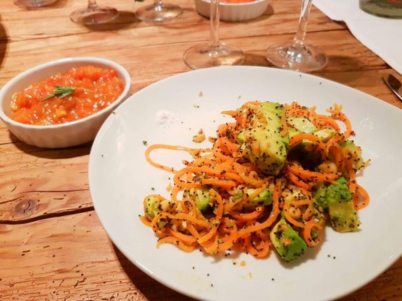 Ein komplett neues Küchenabenteuer war für mich die Hauptspeise. Karotten-Spaghetti mit Avocado hatte ich zwar schon mal daheim gekocht, allerdings noch nie im Zusammenspiel mit geröstetem Mohn & Cashewkernen und dem Papaya-Tomatenchutney mit Limette dazu. Ich liebe es ja neue Zutaten auszuprobieren und sie in verschiedenen Kombinationen zu verbinden… Und hier hat es hervorragend gepasst, ein total geniales Geschmackserlebnis!