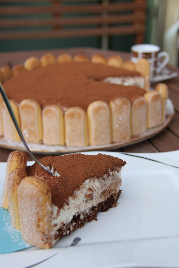 Wenig später als wir beim Espresso/Cappucchino weiter über abenteuerliche Reisen quer durch Italien erzählen, genießen wir dieses köstliche Stück Tiramisu Torte. Der fluffige Biskuitteig mit Kakao, die Creme dazu mit Mascaropone und die Löffelbiskuits machen die Torte perfekt. Durch die italienische Musik im Hintergrund fühlen wir uns schon in den Urlaub versetzt und träumen von Sonne, Spritz, Gelato und Meer.