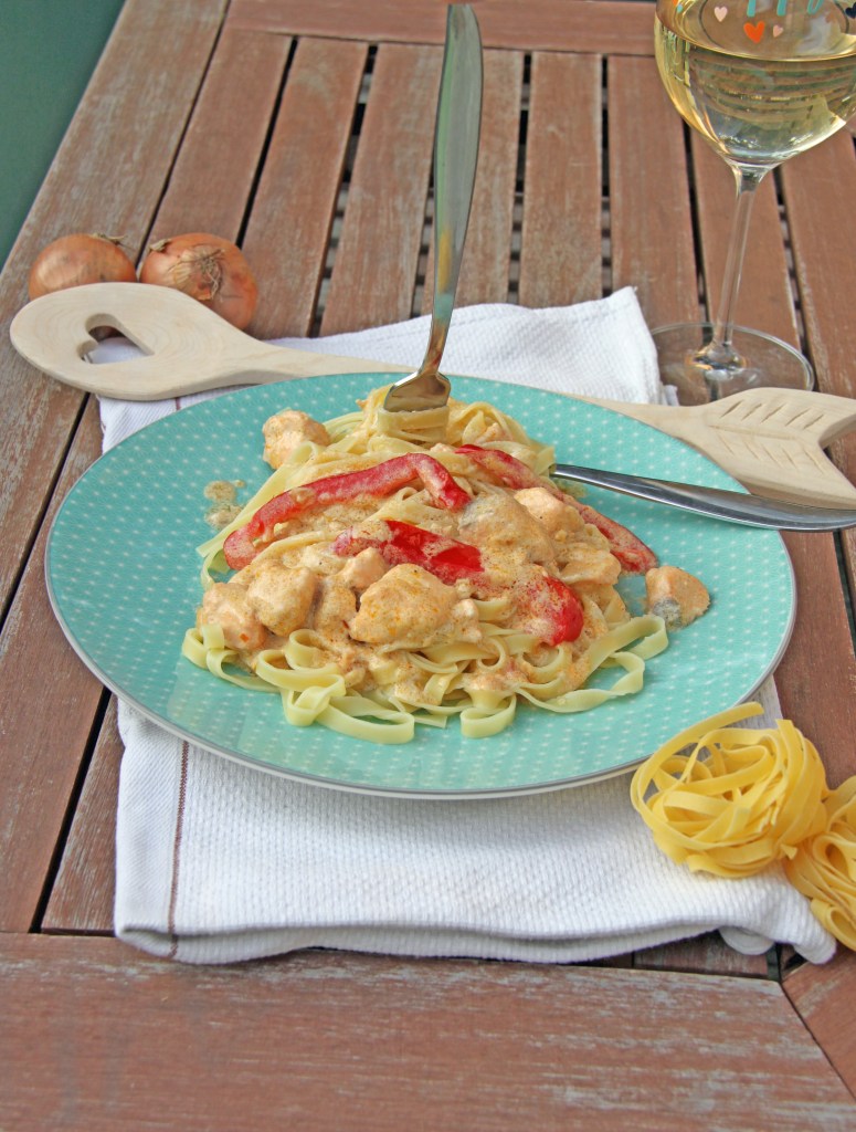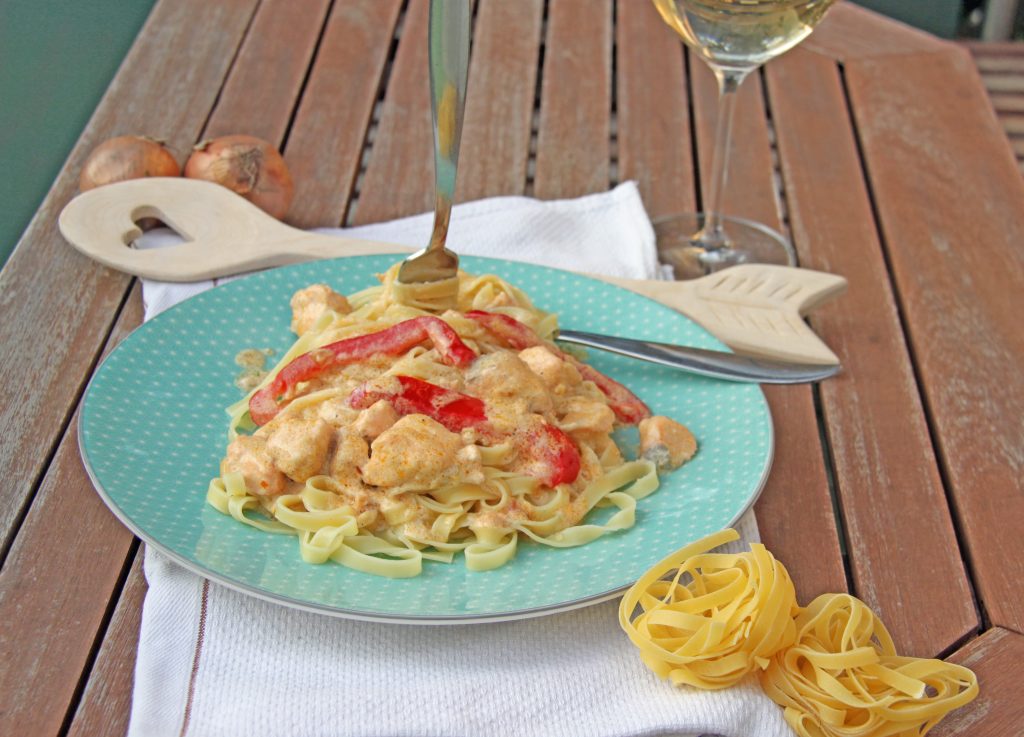 Ganz zart zergeht der Lachs im Mund, die rote Paprika frischt die cremige Soße noch auf und mit dem Gläschen Weißwein dazu, fühle ich mich hier draußen auf der Terrasse bei milden Wetter mit einer leichten Brise fast wie im Urlaub am Meer.