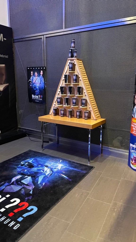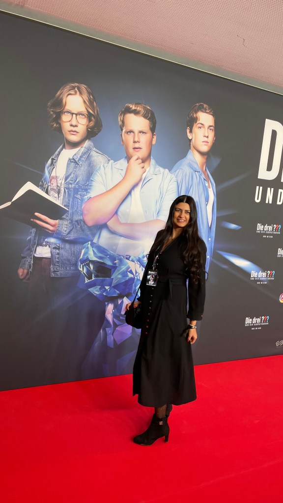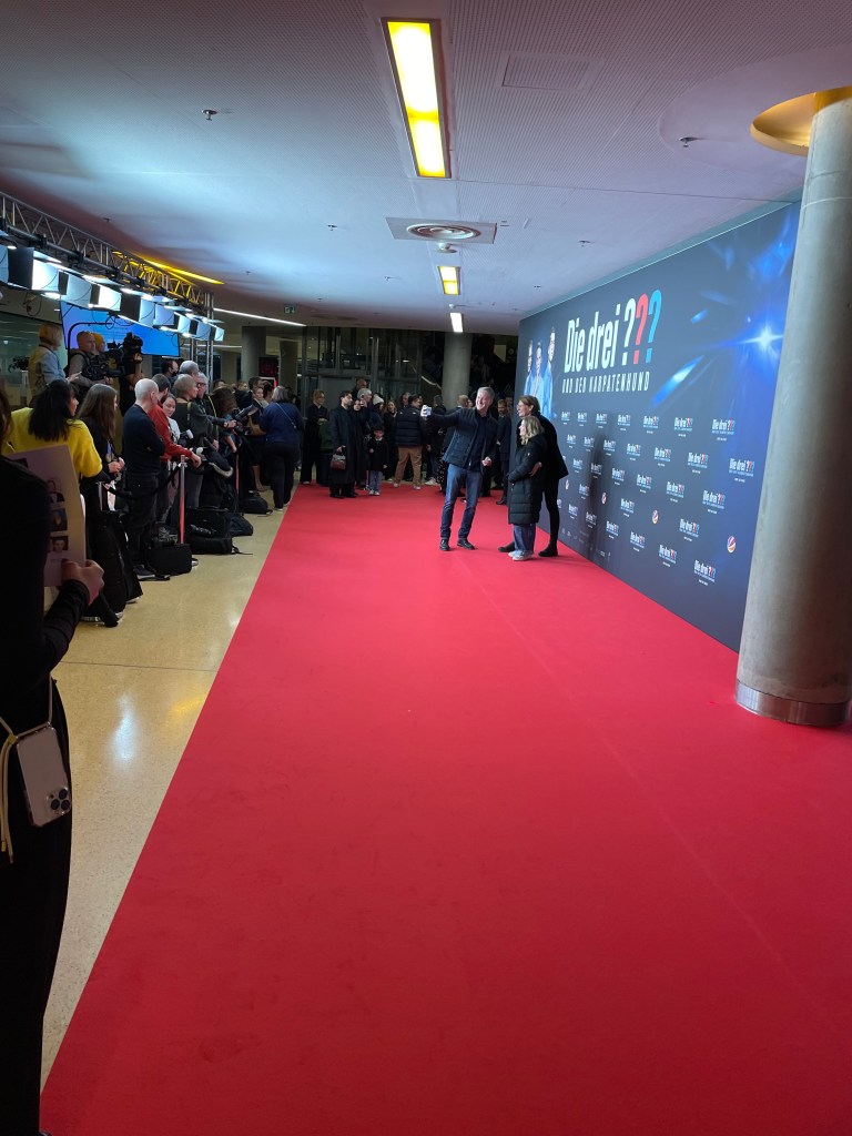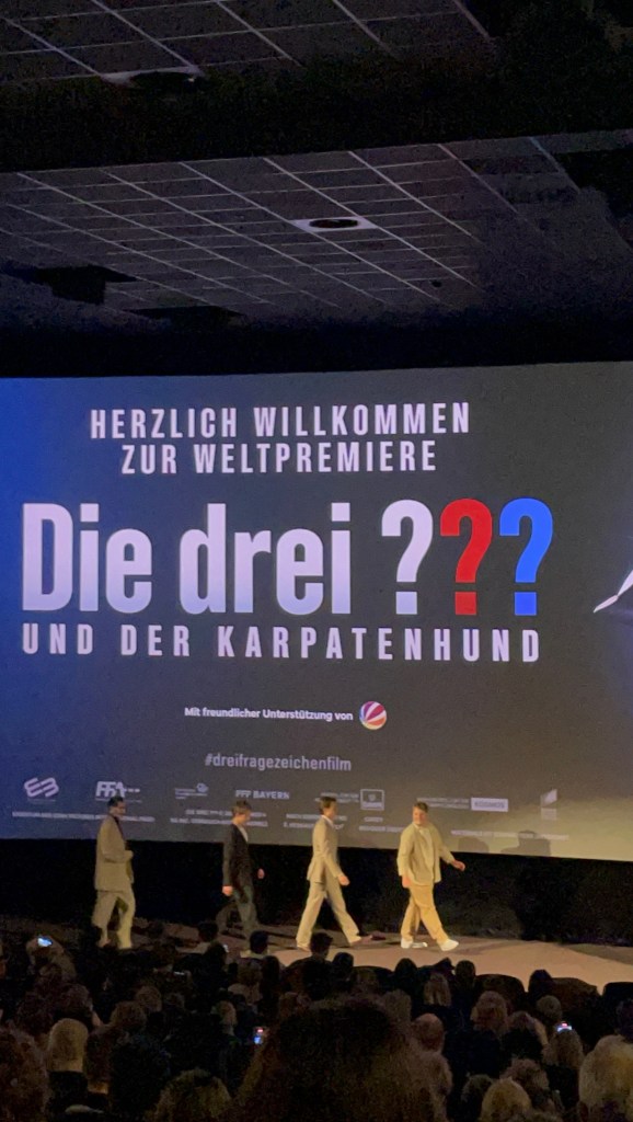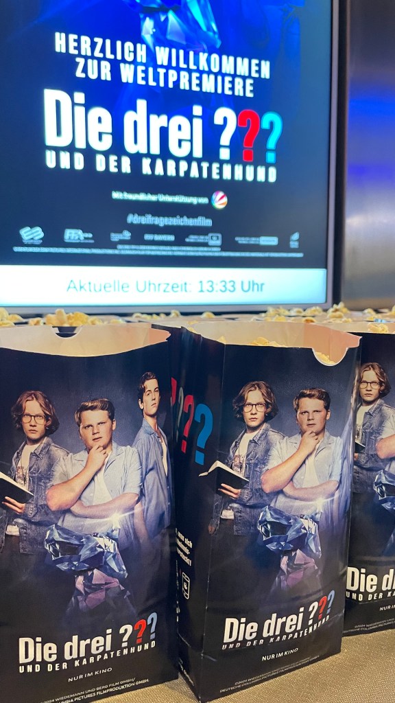 Aber erst muss ich euch unbedingt noch von der Kinoweltpremiere des neuen Kinofilms erzählen! Am 12.01.2025 war ich dort auf dem roten Teppich im Mathäser Filmpalast in München. Neben den Darstellern selbst war noch sehr viel geboten, von Die drei ??? Popcorn, Getränken, über Dosenwerfen mit tollen Gewinnen. Dann ging auch schon die Weltpremiere los, die Darsteller inklusive Regisseur Tim Dünschede machten noch eine Ansprache vor der Leinwand und der Kinofilm startete. 105 Minuten voller Spannung, Spaß und Mitfiebern! Ich kann euch „Die drei ??? und der Karpatenhund“ wirklich empfehlen – für Groß und Klein.