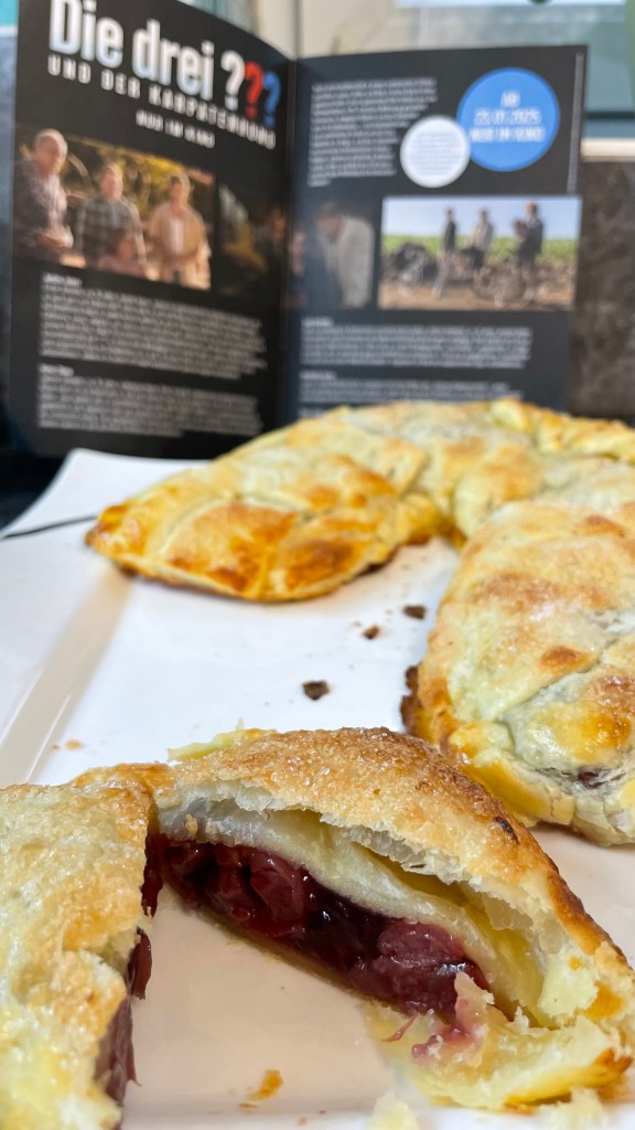 Doch nicht immer ist so viel Zeit zum Backen. Deshalb gibt es jetzt zum neuen Kinofilm „Die drei ??? und der Karpatenhund“ ein schnelles Rezept für Kirschkuchen-Taschen.