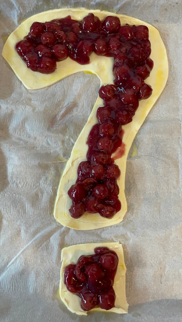 Das Rezept besteht aus nur fünf Zutaten! Ich habe den Blätterteig in Form eines Fragezeichen geschnitten, ihr könnt euch aber natürlich gerne kreativ ausleben und aus dem Blätterteig formen was ihr wollt – egal ob Taschen, Herzen oder ähnliches.